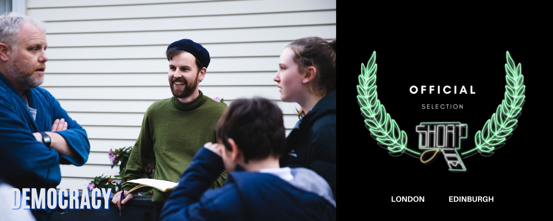 Democracy was selected to feature in a UK short film programme specialising in comedy shorts. It screened in Edinburgh and London in November 2022, part of the Short Com Festival.